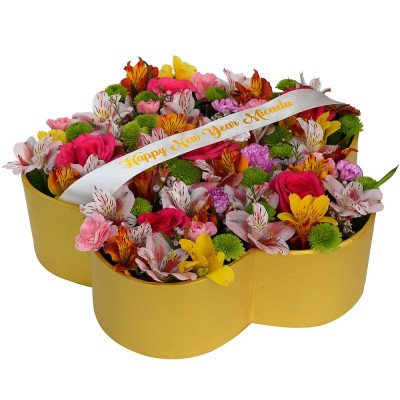 Alegre y original arreglo de rosas, claveles baby, astromelias y flores variadas, decorado con cinta satinada con texto Happy New Year y nombre personalizable. Elaborado en base amarilla con forma de margarita Línea Colors. 35 cm. x 35 cm.