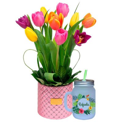 6 rosas y 6 tulipanes coloridos en exclusiva caja Colección Glam Gold con tapa de mica transparente. 65 cm. Largo.