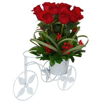Exclusivo arreglo floral de 12 rosas en florero de cerámica decorativa Glam dorada, acompañada de topper Love. Color de rosas según elección.