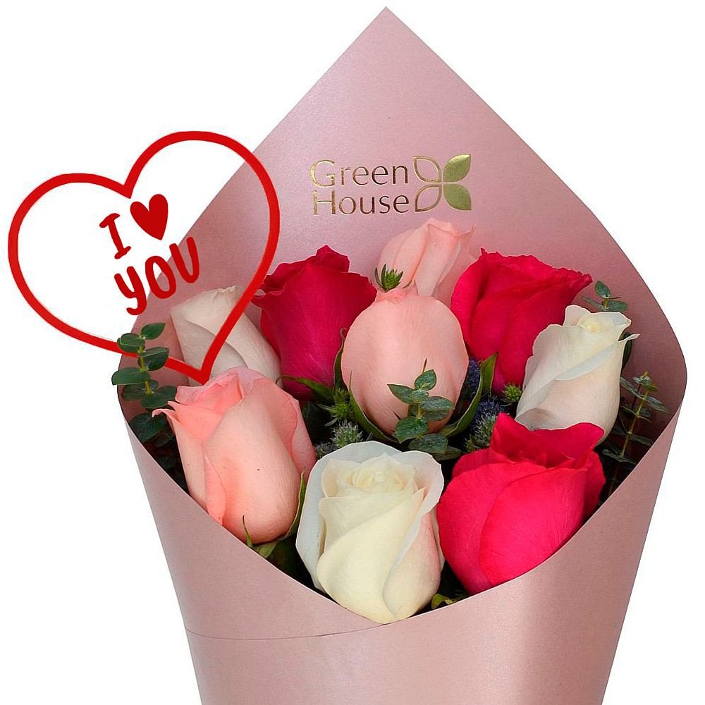Delicado arreglo floral de 7 rosas rojas en base con forma de corazón. 13 cm. De alto.