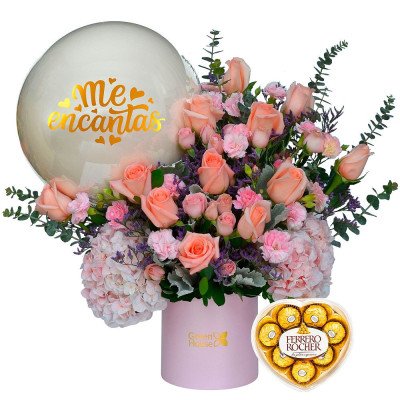 Exclusivo arreglo compuesto de rosas, mini rosas, claveles baby, hortensias y follaje variado, acompañado de globo Me Encantas. 55 cm. Alto. Gratis: Bombones Ferrero Rocher 8 unidades en estuche con forma de corazón.