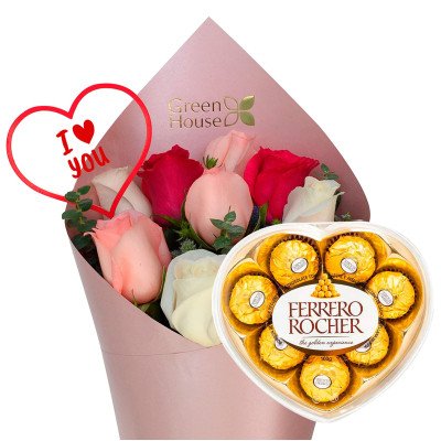 Exclusivo ramo de 9 rosas (fucsias, rosadas y blancas) acompañadas de topper acrílico I Love You y follaje fino, en papel decorativo especial color rosado. Gratis: Bombones Ferrero Rocher 8 unidades en estuche con forma de corazón.