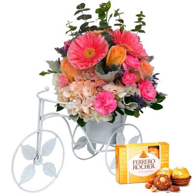 Original triciclo de hojalata con mini rosas, claveles baby, gerberas, hortensias y follaje fino. Gratis: Bombones italianos Ferrero Rocher 4 unidades.