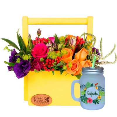 Alegre y delicado arreglo floral de rosas, flores variadas y follaje fino en revistero decorativo de madera. 35 cm. Alto. Gratis: Mug tropical con nombre personalizable.
