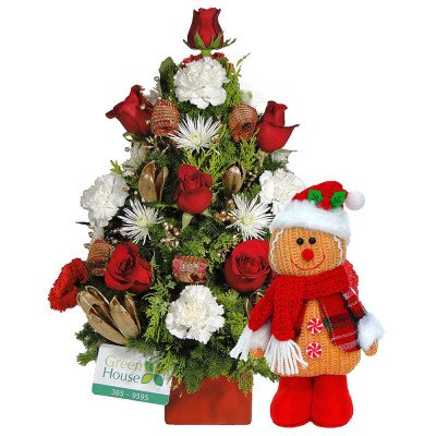 Delicado arbolito compuesto por rosas, claveles, flores variadas y adornos navideños. En florero de cerámica. Gratis: Muñeco Galleta de Jengibre de 25 cm. de alto.
