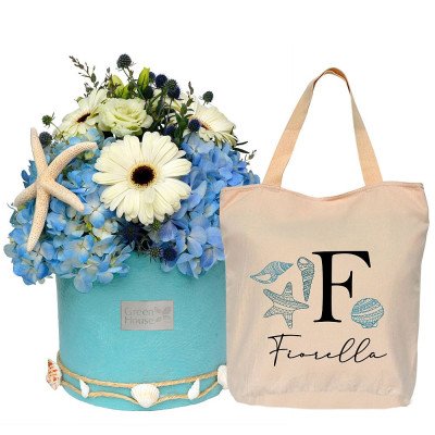 Delicado arreglo de gerberas, hortensias y follaje fino en florero de cerámica decorativa Aqua. 35 cm. Alto. Gratis: Bolso playero con nombre personalizable.