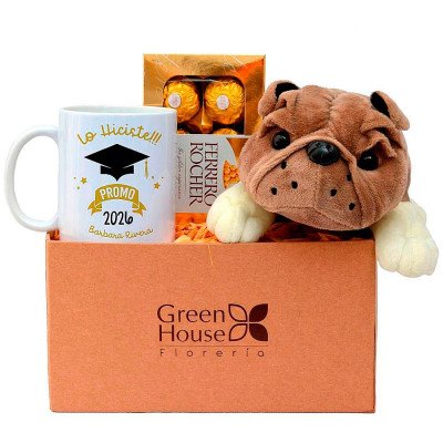 Pack especial que contiene una taza para graduado (personalizable), una caja con 8 Bombones Ferrero Rocher y un bulldog de peluche.