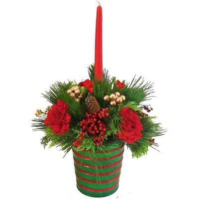 Centro de mesa compuesto por flores variadas, follaje navideño y vela, elaborada en exclusiva base.