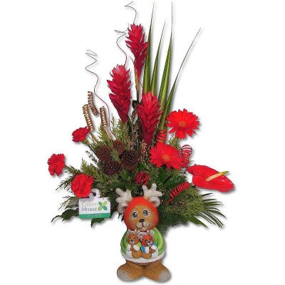 Compuesto por ginger, gerberas, claveles y anturio. En fino florero de cerámica.