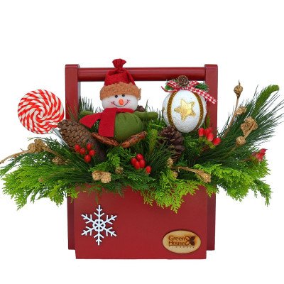 Divertida jardinera compuesta de pino, tuja y follaje fino, decorada con adorno navideño, muñequito y paleta dulce. En fino revistero de madera. 35 cm. Alto.