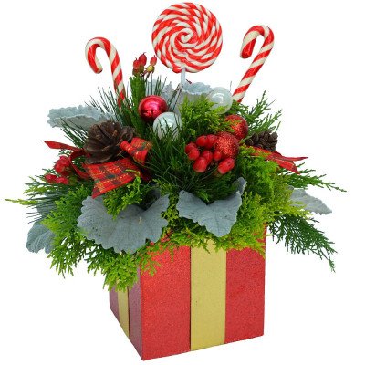 Delicado arreglo navideño compuesto de pino, tuja, follaje fino y adornos navideños, decorado con dos bastones y una paleta de caramelo. 25 cm. alto.