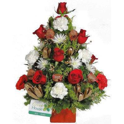 Delicado arbolito compuesto por rosas, claveles, flores variadas y adornos navideños. En florero de cerámica.