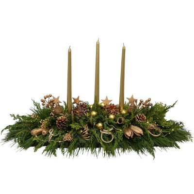 Exclusivo camino compuesto de ciprés, pino, tuja, molle, velas y detalles navideños. Adornado con luces. En base decorativa. Medidas: 70 cm. largo, 30 cm. ancho, 40 cm. alto.