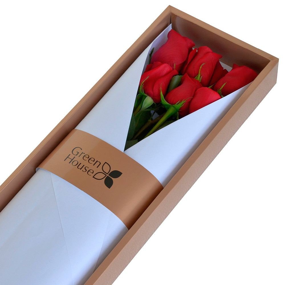 6 rosas en exclusiva caja Glam Gold con tapa de mica transparente. 65 cm. Largo. Color de las rosas según elección.
