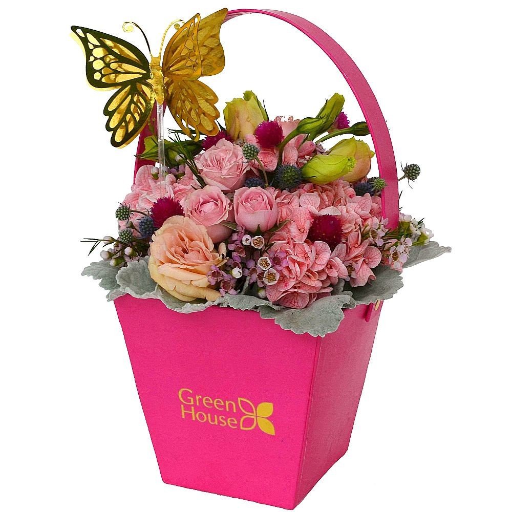 Alegre y delicado arreglo de mini rosas, hortensias, flores variadas y follaje fino, decorado con un topper mariposa. Elaborado en cesta fucsia Línea Colors. 35 cm. Alto.