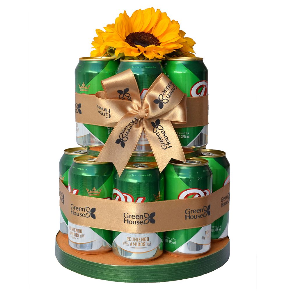 Elaborada con 13 latas de cerveza Pilsen (355 ml.), decorada con girasoles.