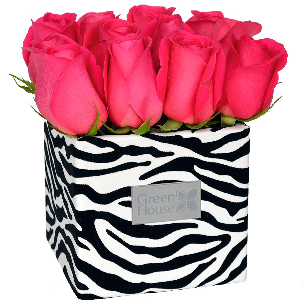 Exclusivo arreglo floral de 12 rosas en florero de cerámica decorativa Amazonía Zebra. 20 cm. Alto. Color de las rosas según elección.