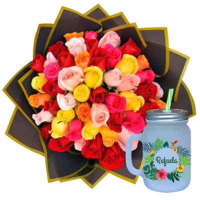 RAMO BUCHÓN 50 ROSAS COLORIDAS + ¡GRATIS! MUG TROPICAL PERSONALIZABLE
